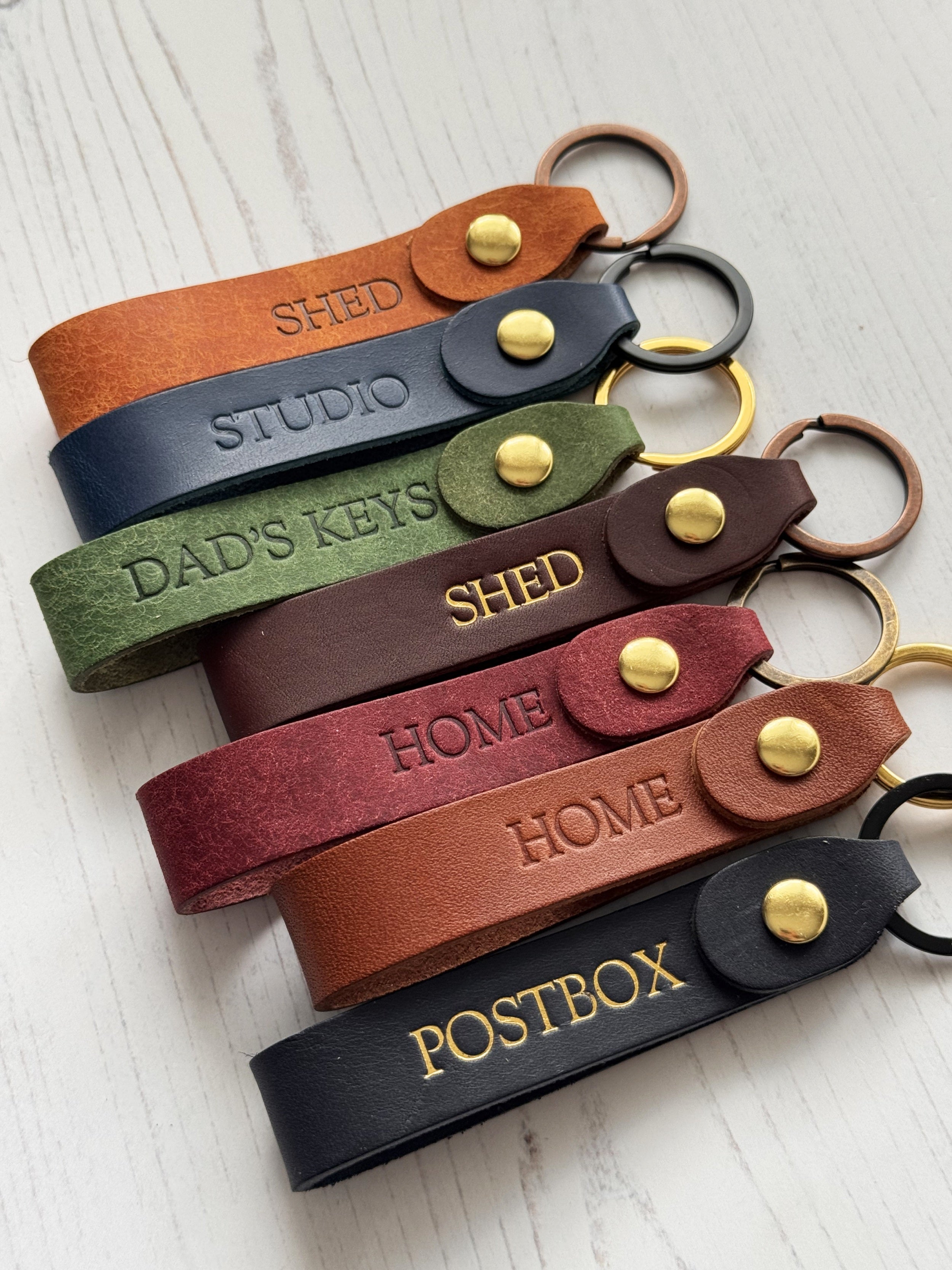 Every keyring is personalised to order with your chosen word or name – perfect for labelling “HOUSE”, “CAR”, “SHED”, or something more unique to you. Finished with your choice of gold or blind debossed text and a solid brass or black metal fitting, it’s a simple yet elegant design that only gets better with age.