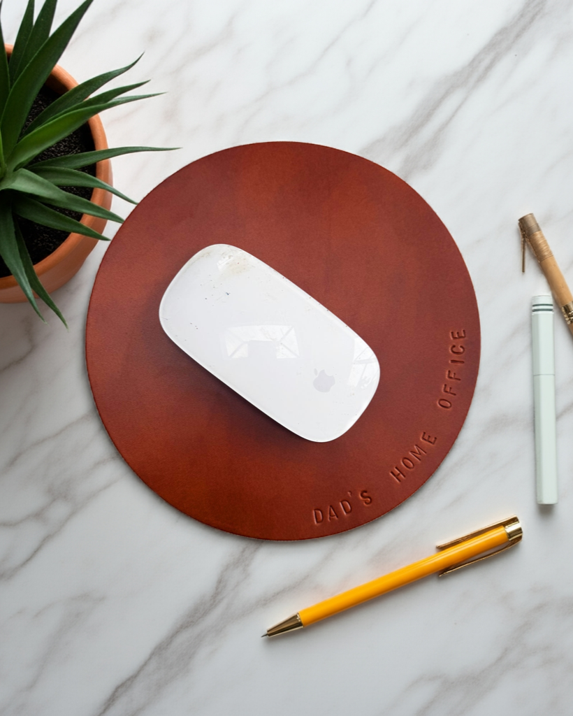 Elevate your desk space with our Personalised Leather Mouse Mat, handcrafted in the UK from premium Italian Buttero leather. Designed with both style and function in mind, each round mat is cut, finished, and stamped by hand, creating a unique and tactile workspace essential. Available in tan, brown, or black, the smooth leather surface is perfect for all mouse types and develops a beautiful patina over time. Personalise it with a name, initials, or meaningful phrase—like “Dad’s Home Office” or “Let’s Create”—to add a thoughtful touch to your home office or to gift to someone special. Whether you're shopping for Father’s Day, a birthday, or simply upgrading your own work-from-home setup, this timeless piece combines craftsmanship and practicality in true Parkin & Lewis style.