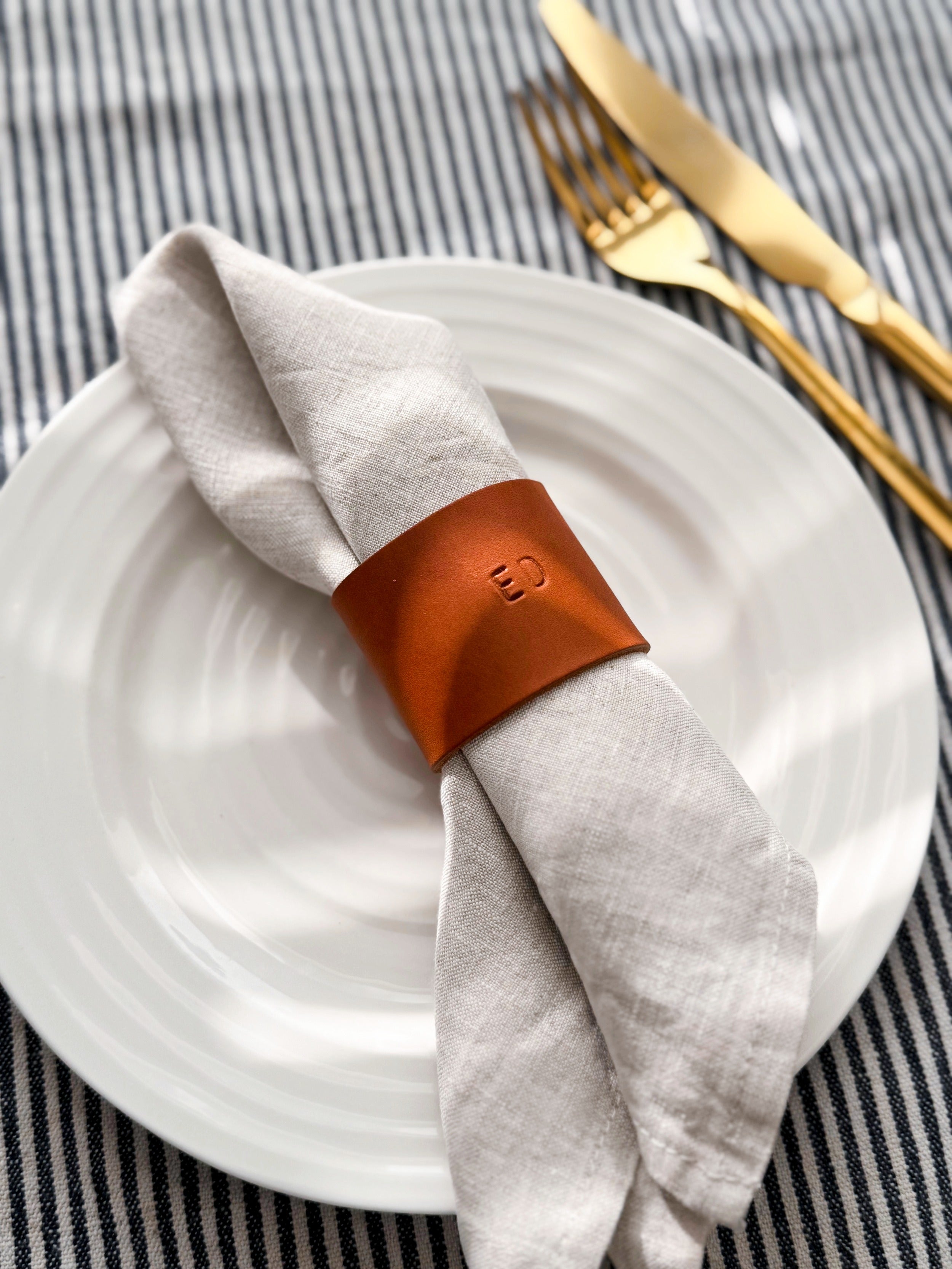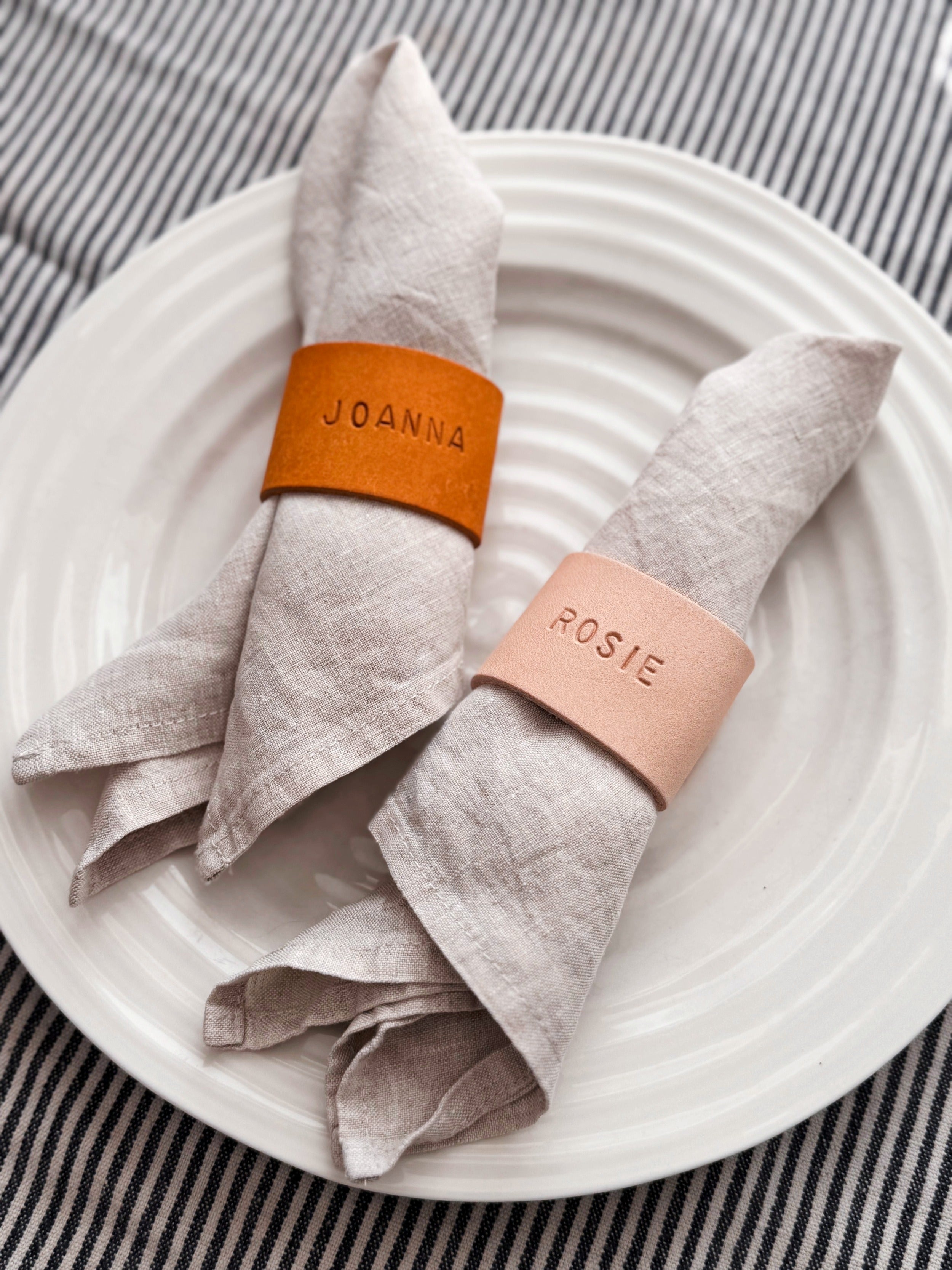 Add a touch of timeless elegance to your table with these handcrafted leather napkin rings. Each one is made from premium, vegetable-tanned leather and hand-stamped with your chosen name or word — creating a truly personal detail that will elevate any dining occasion.