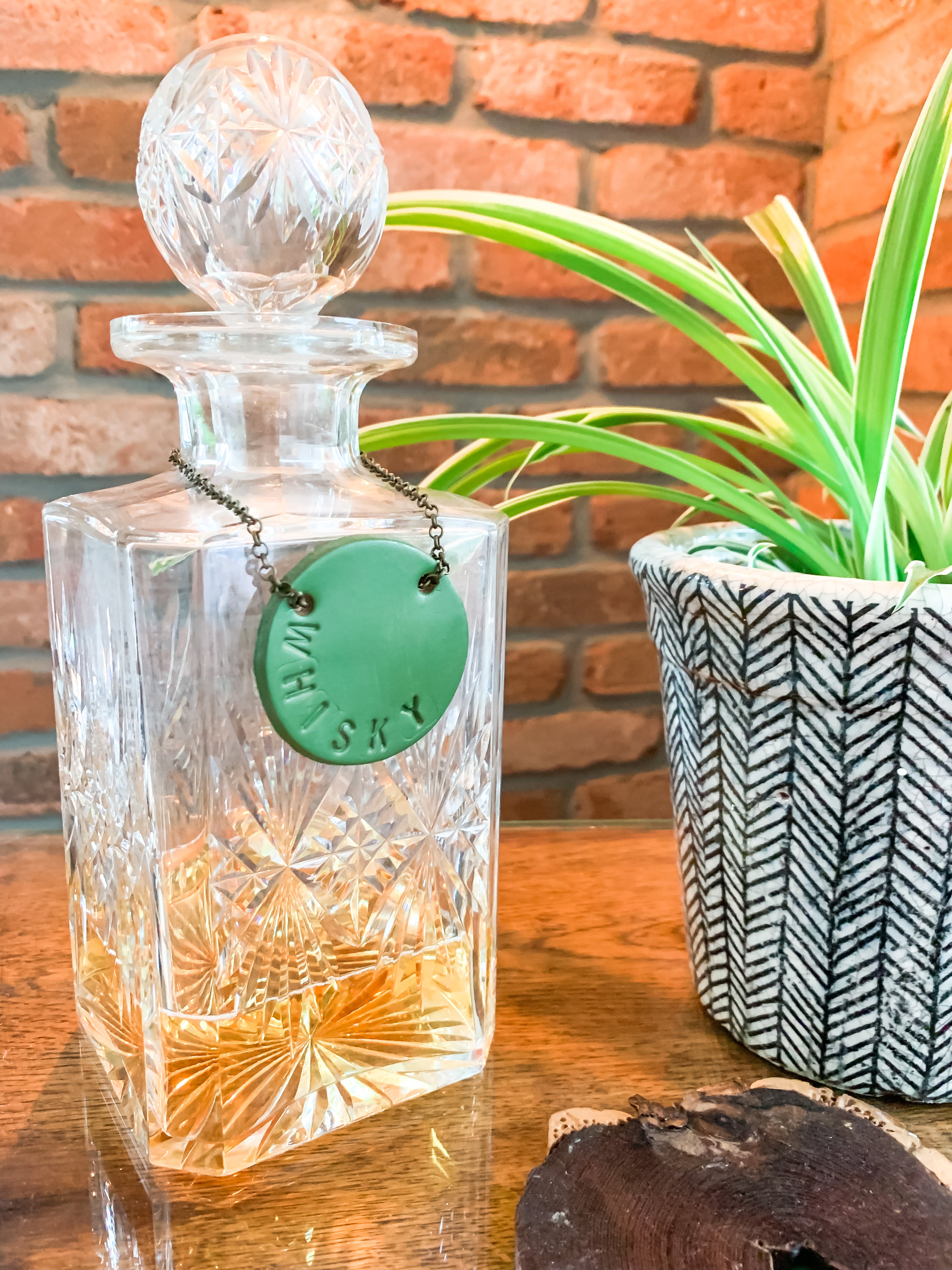 Hand stamped leather bottle necklaces. A very chic way to label what is inside your decanter. With up to 10 letters why not get creative.