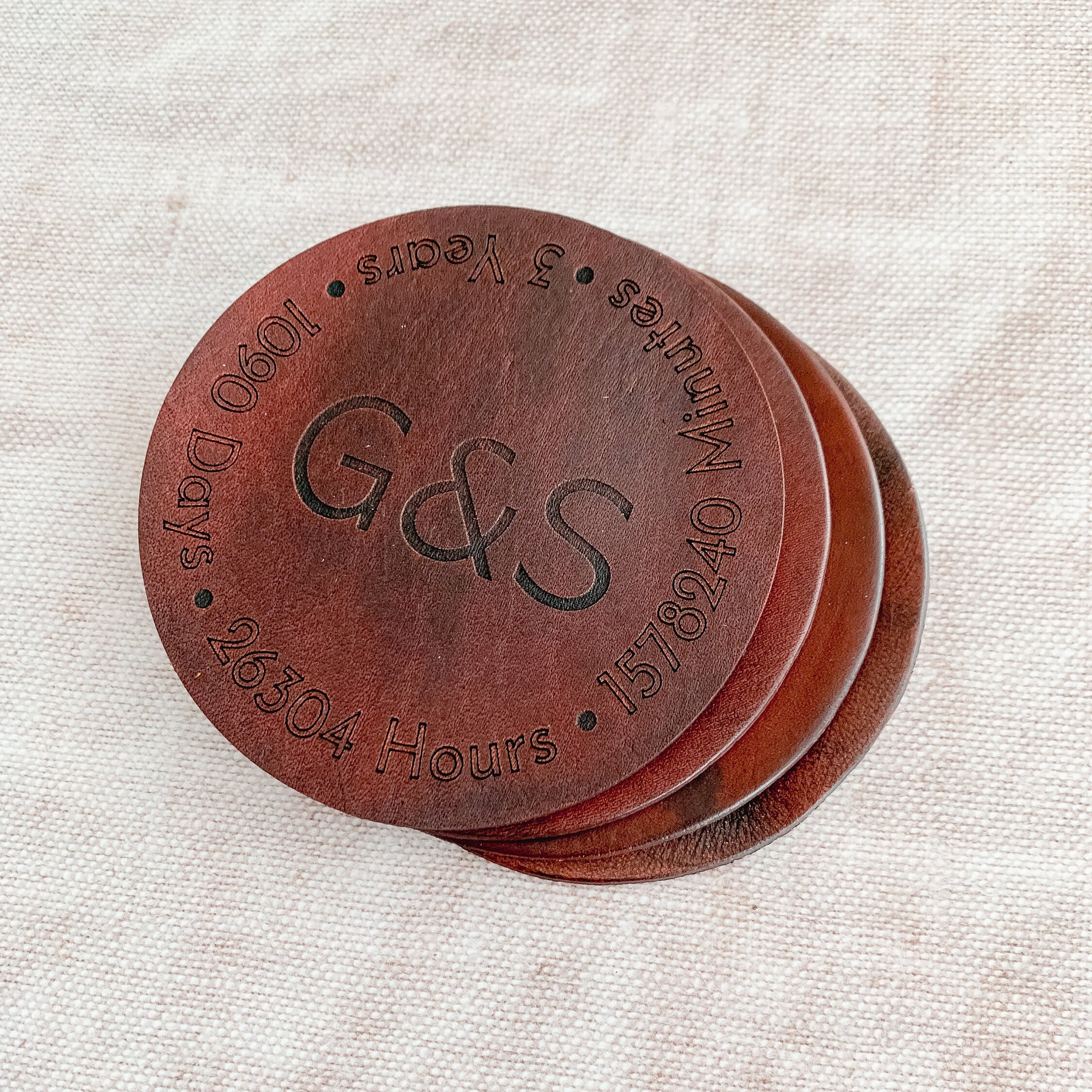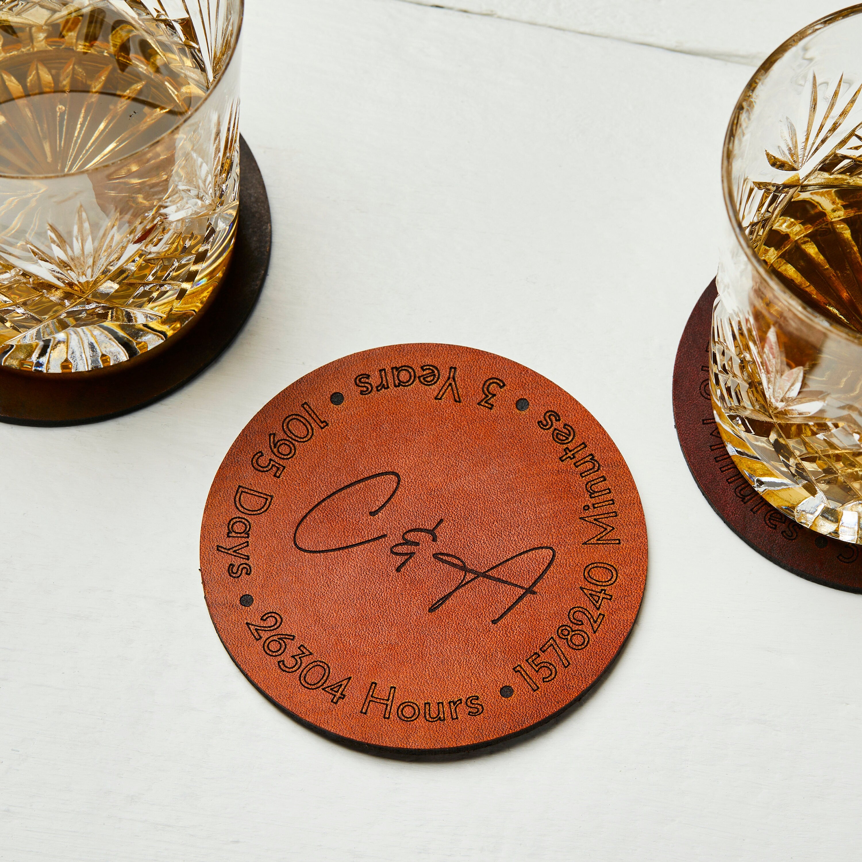A handmade leather coaster in a selection of colours, personalised with your two initials complete with 3 Years in different measurements around the edge.