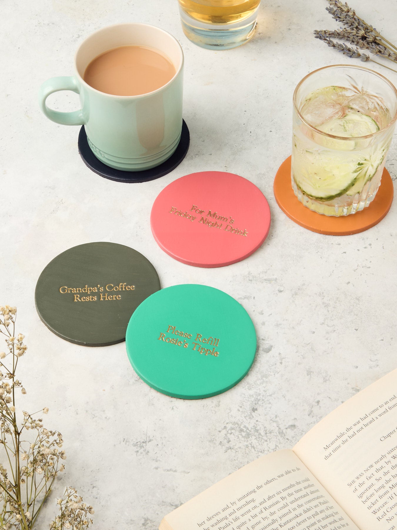Available in a range of vibrant colours, each coaster can be customised with your choice of text in gold lettering, creating a thoughtful, unique gift for friends, family, or yourself.