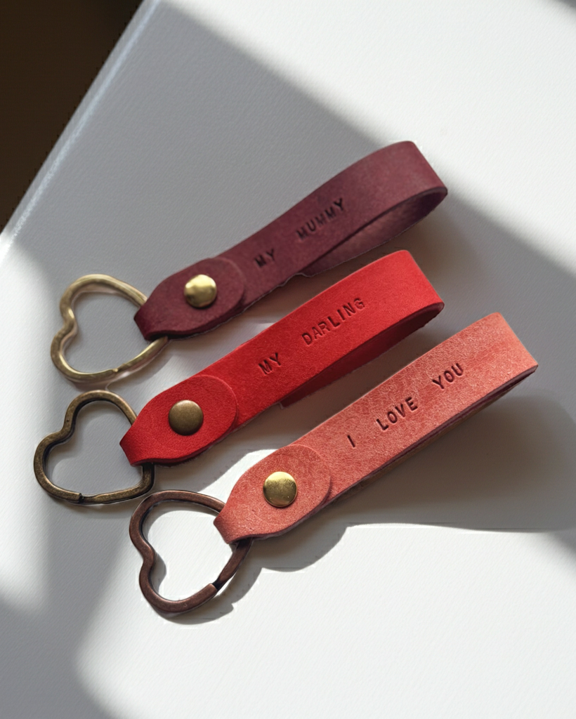 Personalise your keyring with a short message, name or meaningful words, stamped neatly into the leather. Whether it’s “I love you”, “My darling” or something uniquely yours, the minimal text makes this a quiet but heartfelt gift.